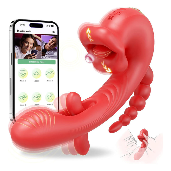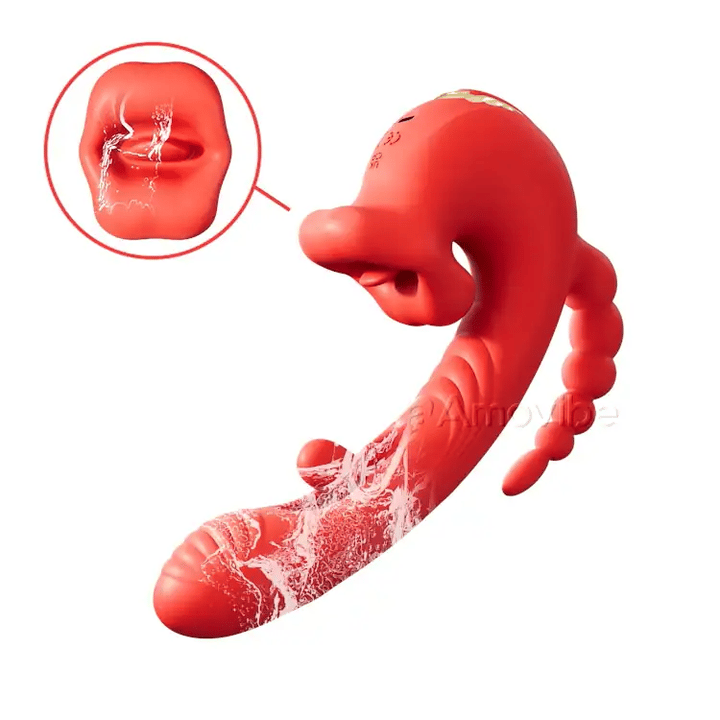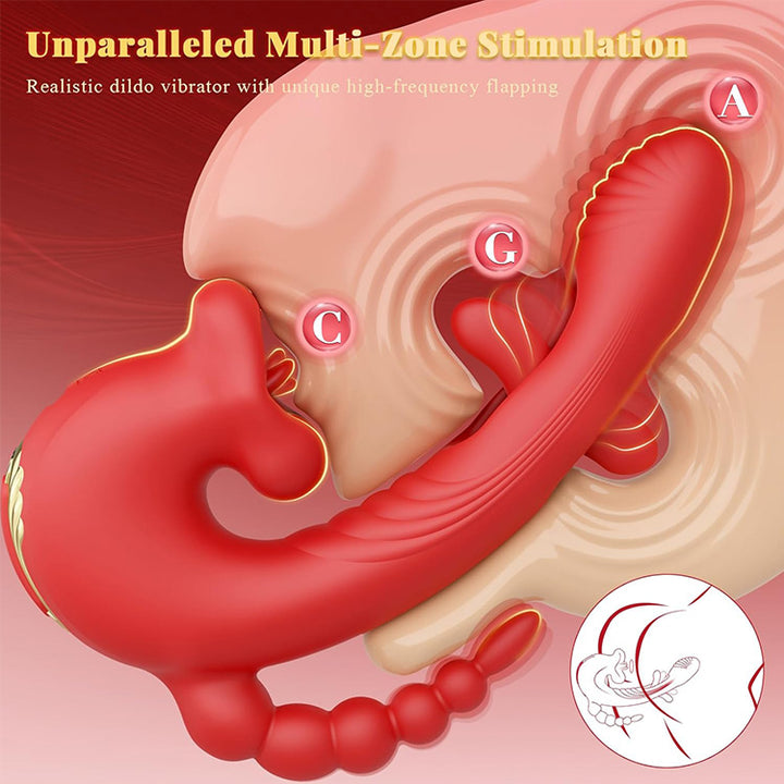 This uniquely designed vibrator combines 9 licking modes, 9 flapping modes, and 9 vibration patterns—all crafted for full-body stimulation. From the realistic dildo shaft to the clit-licking mouth and anal bead tail, this 5-in-1 toy delivers intense pleasure from every angle.